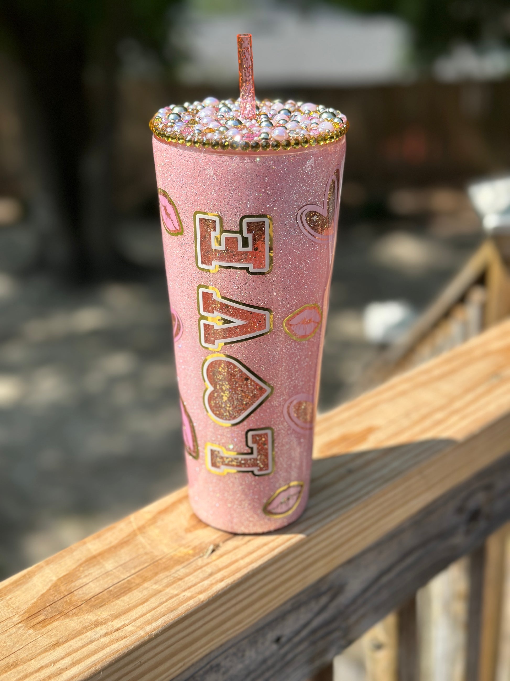 Add a touch of glamour and sparkle to your beverage with our Pink LOVE Glitter Globe 24oz Acrylic Cup. The gold peek-a-boo glitter globe and pink and gold details make it a stylish accessory, while the blinged out lid keeps your drink secure. Perfect for adding some shine to your daily routine.